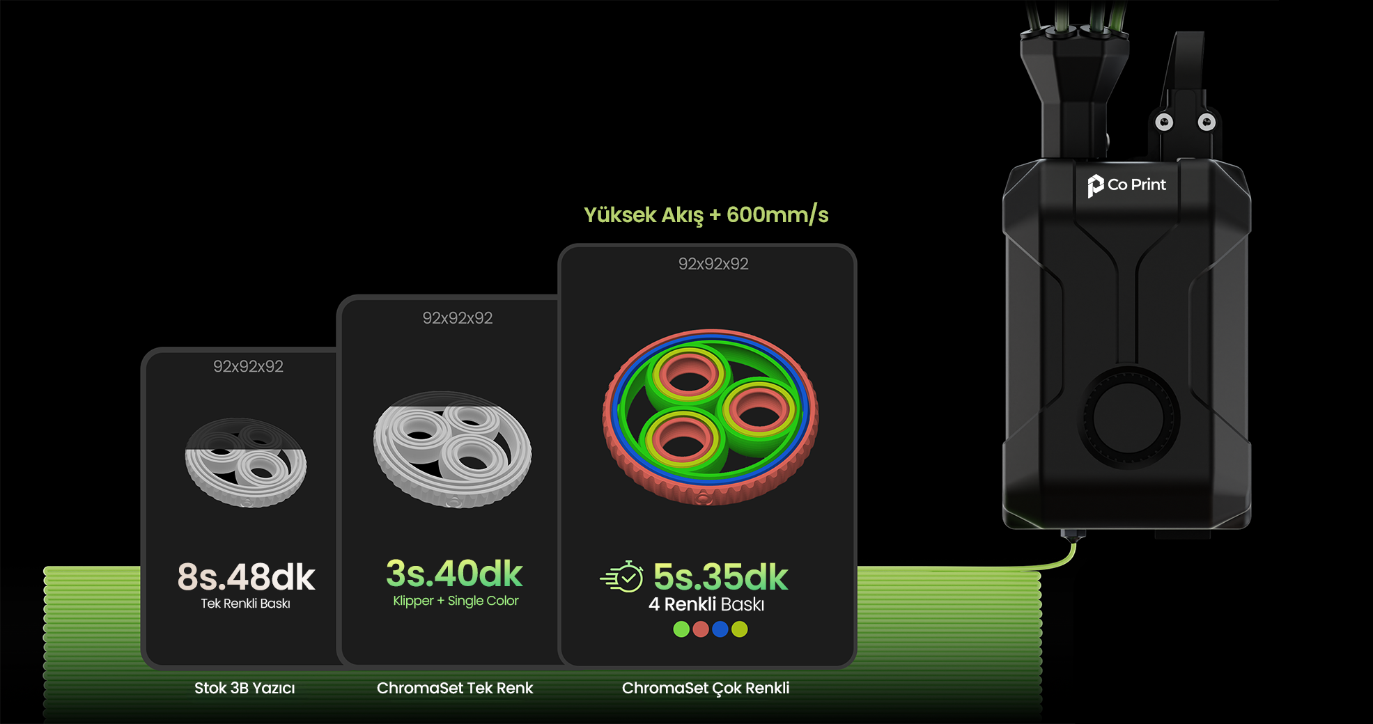 ChromaSet, stok bir 3D yazıcıya kıyasla çok daha hızlıdır ve 4 farklı filament ile renkli baskılar yaparken bile üstün bir performans sergiler. Bunun yanı sıra, ChromaPad ve ChromaHead ile hızlı ve verimli tek renkli baskılar da alabilirsiniz.