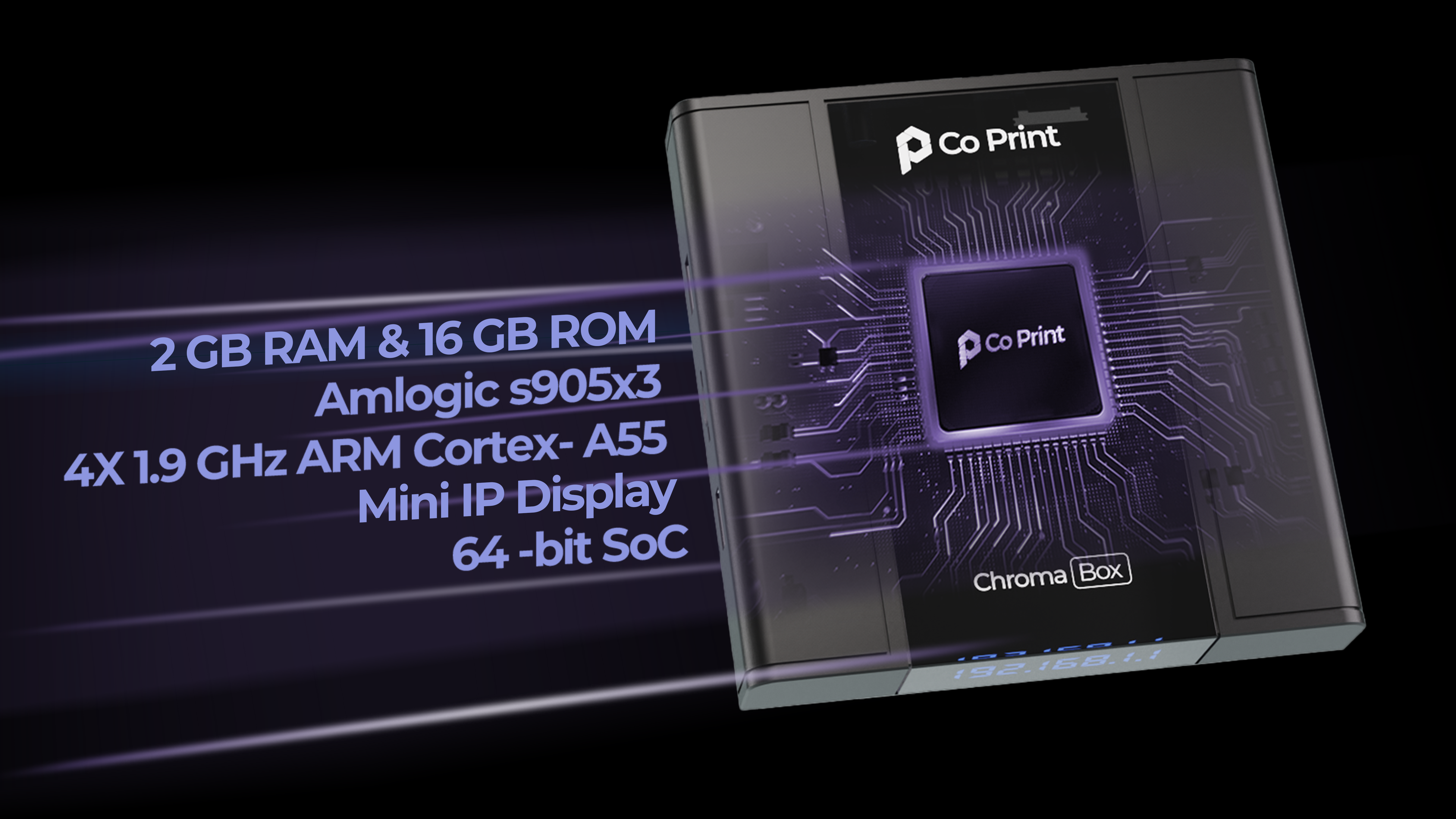 ChromaBox features a quad-core 1.9 GHz processor, 2 GB RAM, and 16 GB internal storage, capable of handling multiple printers simultaneously without lag  ensuring a stable and smooth multi-color printing experience.